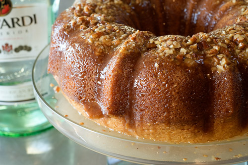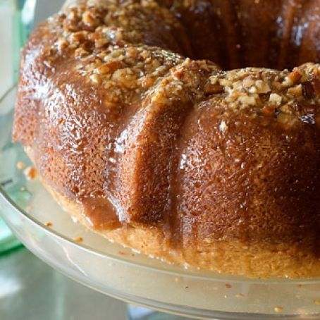 Cool cake in pan for about 20 minutes. Prick entire bottom of cake with a toothpick and brush about 2/3 of the sauce over it using a basting brush. Invert cake on to plate. Prick top and sides and brush remaining sauce all over (including the inside of the center hole).