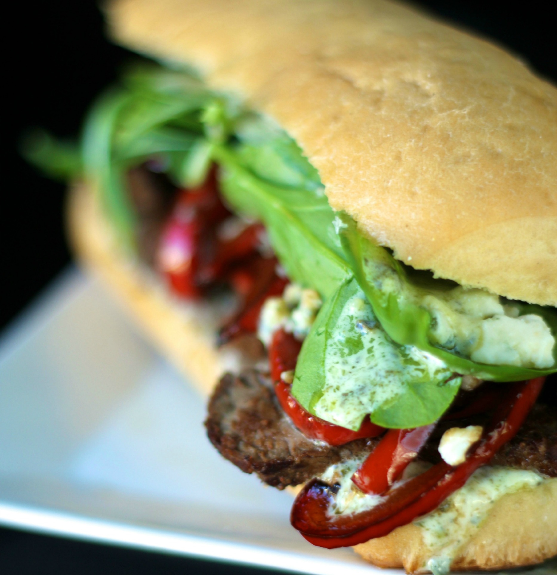 Open the sandwich rolls and spread a layer of pesto mayo on both sides of the roll. Top the bottom slice with the warmed steak slices, gorgonzola cheese crumbles, sautéed red peppers, and lettuce mix. Add the top bun and serve. Makes 4 sandwiches.
