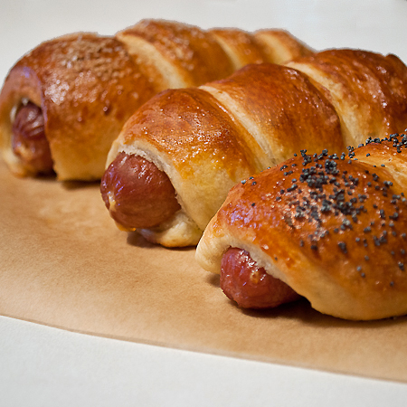 Dry the hot dogs thoroughly. Starting at one end of a hot dog, wrap the dough around overlapping slightly as you make your way to the other end. Place seam side down on a parchment lined baking sheet and repeat with remaining hot dogs and strips of dough. Cover loosely with a kitchen towel and let stand in a warm place for about 30 to 45 minutes.