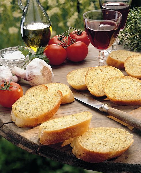 Dip each slice of bread into the garlic mixture, turning to coat each side. Place Parmesan cheese on a plate. Press one side of each piece of bread into the cheese, and place cheese side up on a baking sheet.