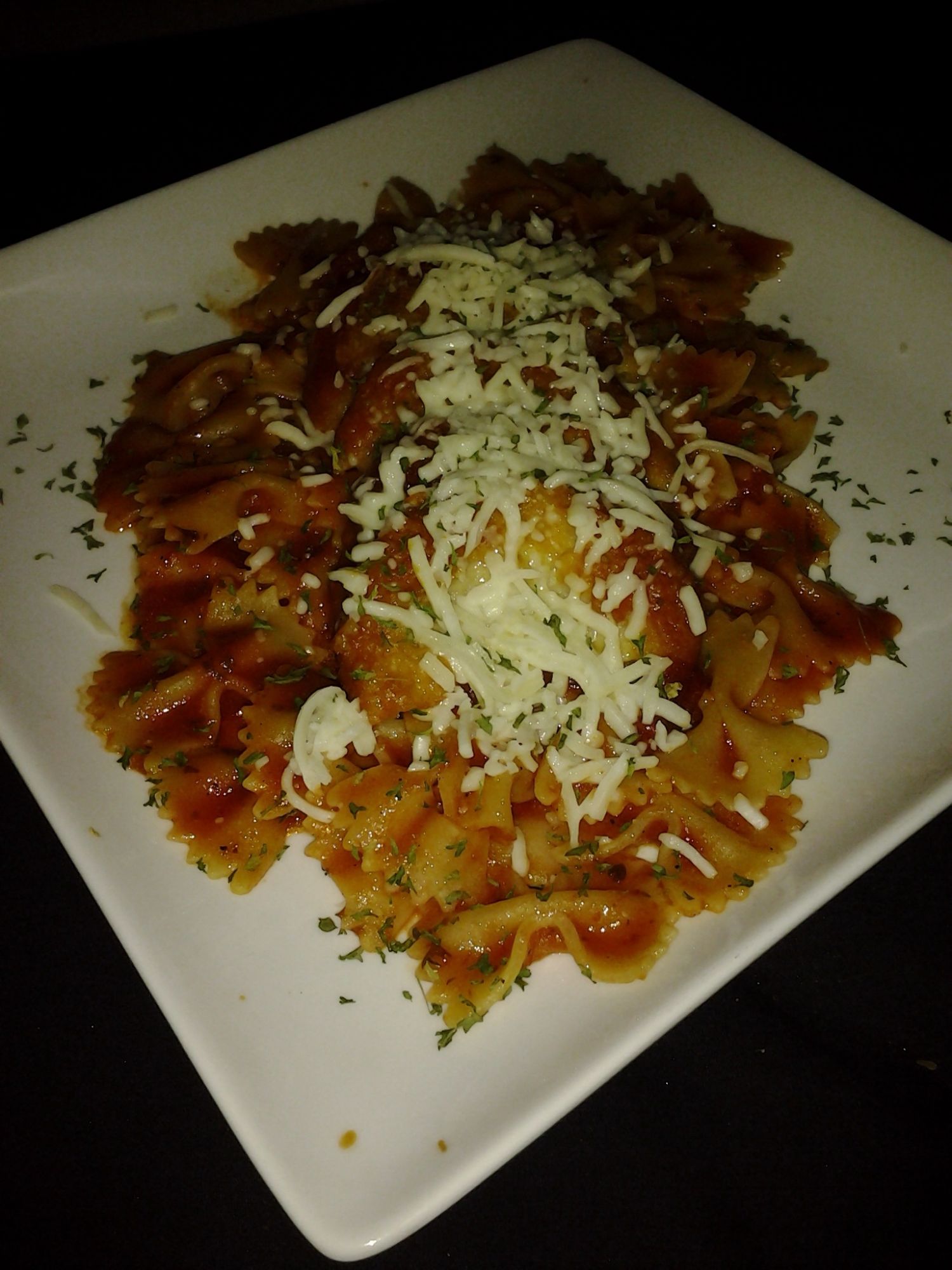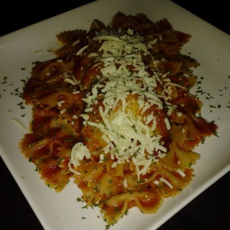 In a skillet bring the olive oil to frying temperature. Brown the breaded chicken cutlets until golden brown. The. Drain on paper towels. In the frying oil, sauté the onions and garlic until they're soft. Add the marinara sauce, sugar, and Italian seasoning. Cook for 3 minutes to thicken the sauce. Cook the Farfalle pasta until al dente. Toss in half the marinara into the cooked pasta and coat it well. Plate the pasta then top with the cooked chicken cutlets, more sauce, shredded cheese, and fresh basil.