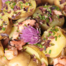 After boiling your potatoes, gently cut each potato into roughly 20 small pieces and discard the skin of the potatoes
