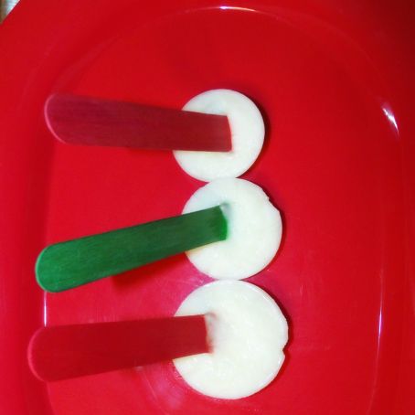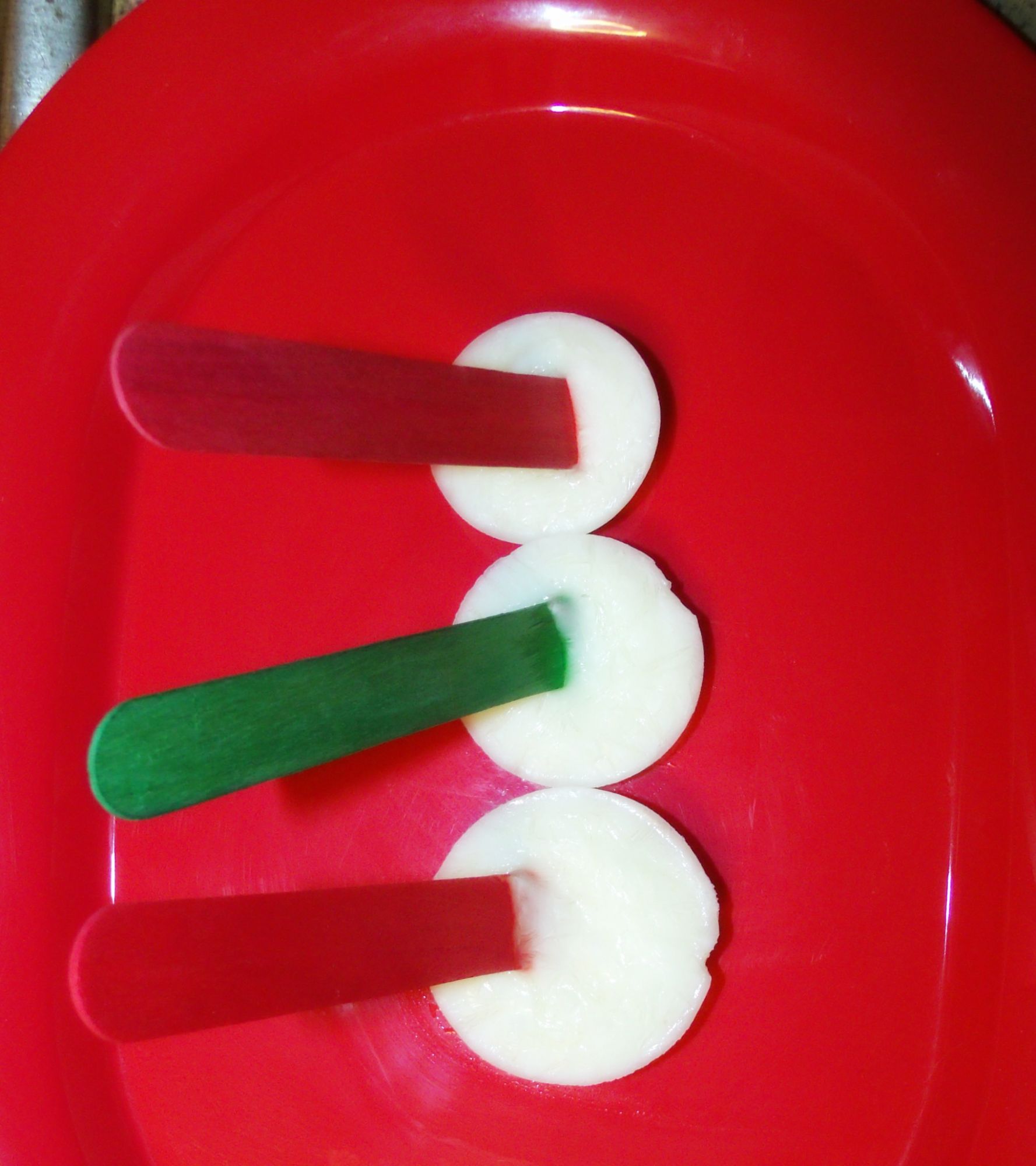 Pour mixture into circular freezie pop molds and place your red and green popsicle sticks in the center