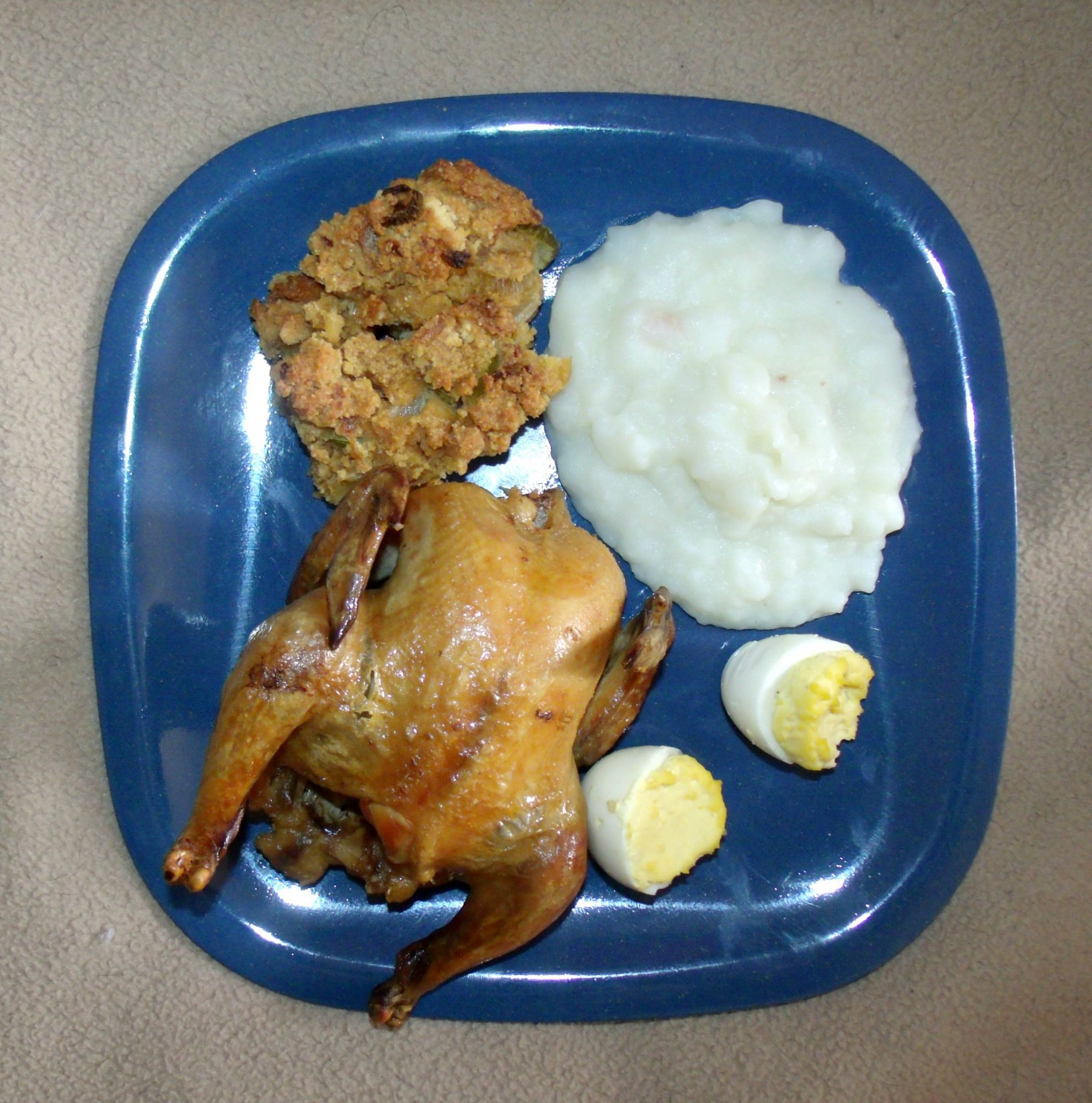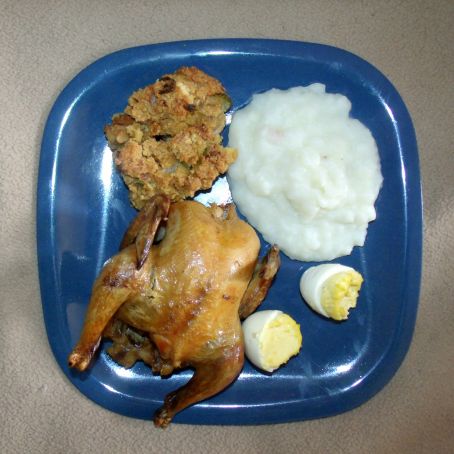 - Cornish Game Hen, Creamed Eggs, Mashed Potatoes, Homemade Stuffing