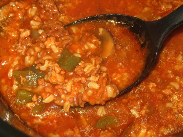 In a large stock pot, add hamburger mixture, the rice and all remaining ingredients except for the cheese and stir.