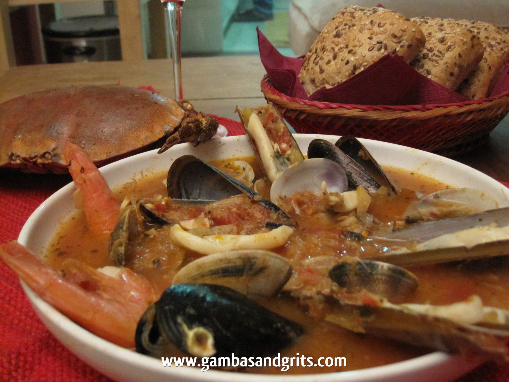 Remove the crab and any unopened mussels or clams, stir in chopped Italian parsley, ladle into bowls and serve with crostini, anchovy bread, garlic bread or the like.