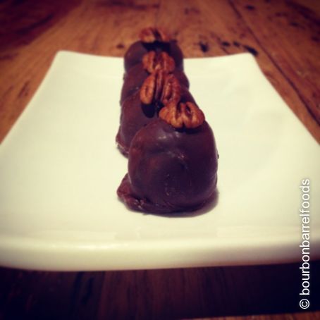 Melt the candy coating. With two toothpicks, dip the bourbon balls into the candy coating and place on another baking sheet lined with parchment. You may want to work in batches so they stay cold. Top each bourbon ball with a pecan half.