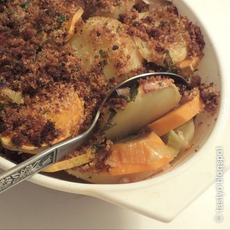 Mix together the Gratin ingredients and spoon the mixture covering the potatoes.