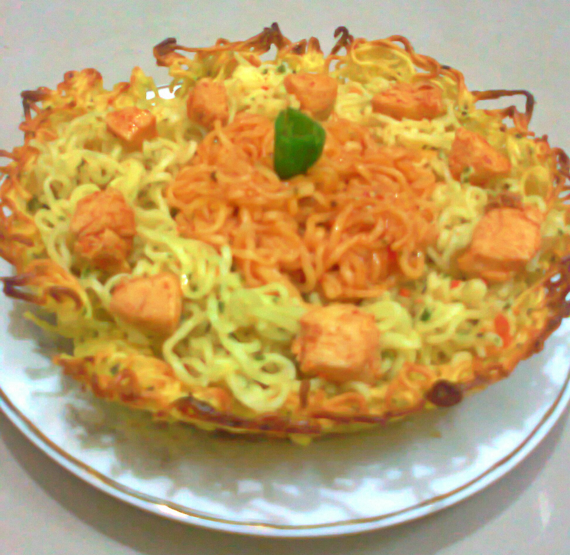 Fill noodles nest with prepared noodles, top with chicken and serve.
