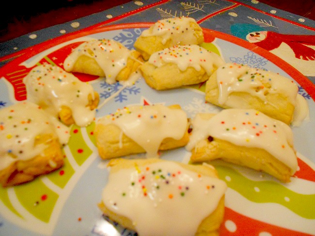 These are a little time-consuming to make, but you will find that they are a fun family recipe to make together. I have made the filling very easy, as compared to other filings, and the dough is a lighter and flakier than most recipes. You can feel free to flavor the glaze with vanilla or almond extracts, but the traditional Italian cookie recipe is made with sugar and milk only. Multi colored sprinkles are traditionally used, and the ones I use are called "jimmies," or the round multi colored ones.