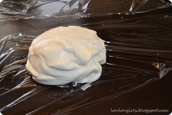 Pick up your ball of fondant and a handful of shortening and cover the whole thing with it. If you don’t, your fondant will stick to the plastic wrap and it’s not easy to get off.
