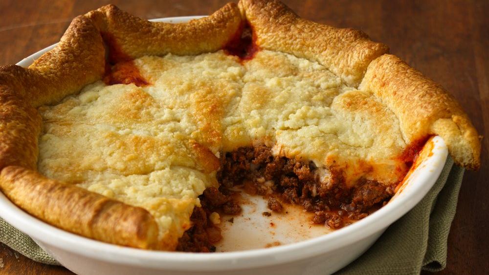 Pour hot beef mixture into ungreased 9 1/2 or 10-inch glass deep-dish pie pan or 11x7-inch (2-quart) glass baking dish. Spoon cheese mixture over beef mixture.