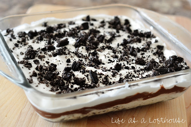 Set aside half of the cookie crumbs for the topping. Pour the other half of cookie crumbs into a 9×13 baking pan. Pour the melted butter over the crumbs and mix well to combine. Once combined, press into the pan to form a crust.