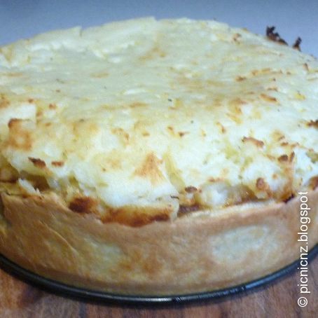 Pour the beef filling mixture over the prepared, blind baked, pastry case. Spread grated cheese over top and top with mashed potato.