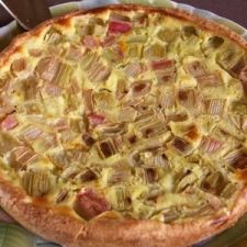 - Fill an 8x8 pan with diced rhubarb. Sprinkle with 3/4 c. sugar and one 3 oz box of raspberry jello. Cover with 1/2 pkg white cake mix and pour 3/4 cup water over the top. Drizzle with 5 T melted butter