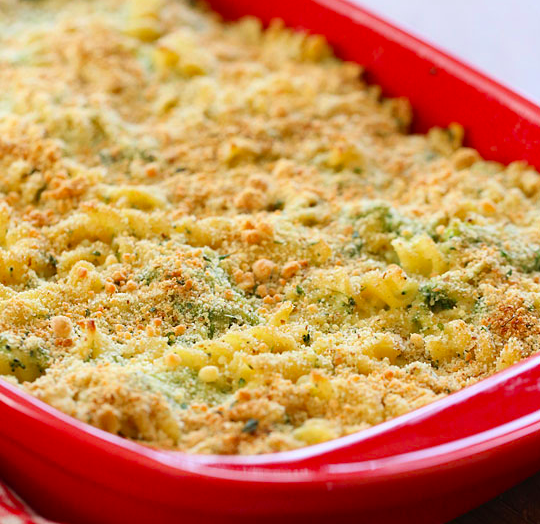 Once the sauce is thick, remove from heat, add cheese and mix well until cheese is melted. Adjust salt and pepper to taste, add cooked macaroni and broccoli and mix well. Pour into prepared baking dish. Top with grated cheese and breadcrumbs. Spray a little more cooking spray on top.