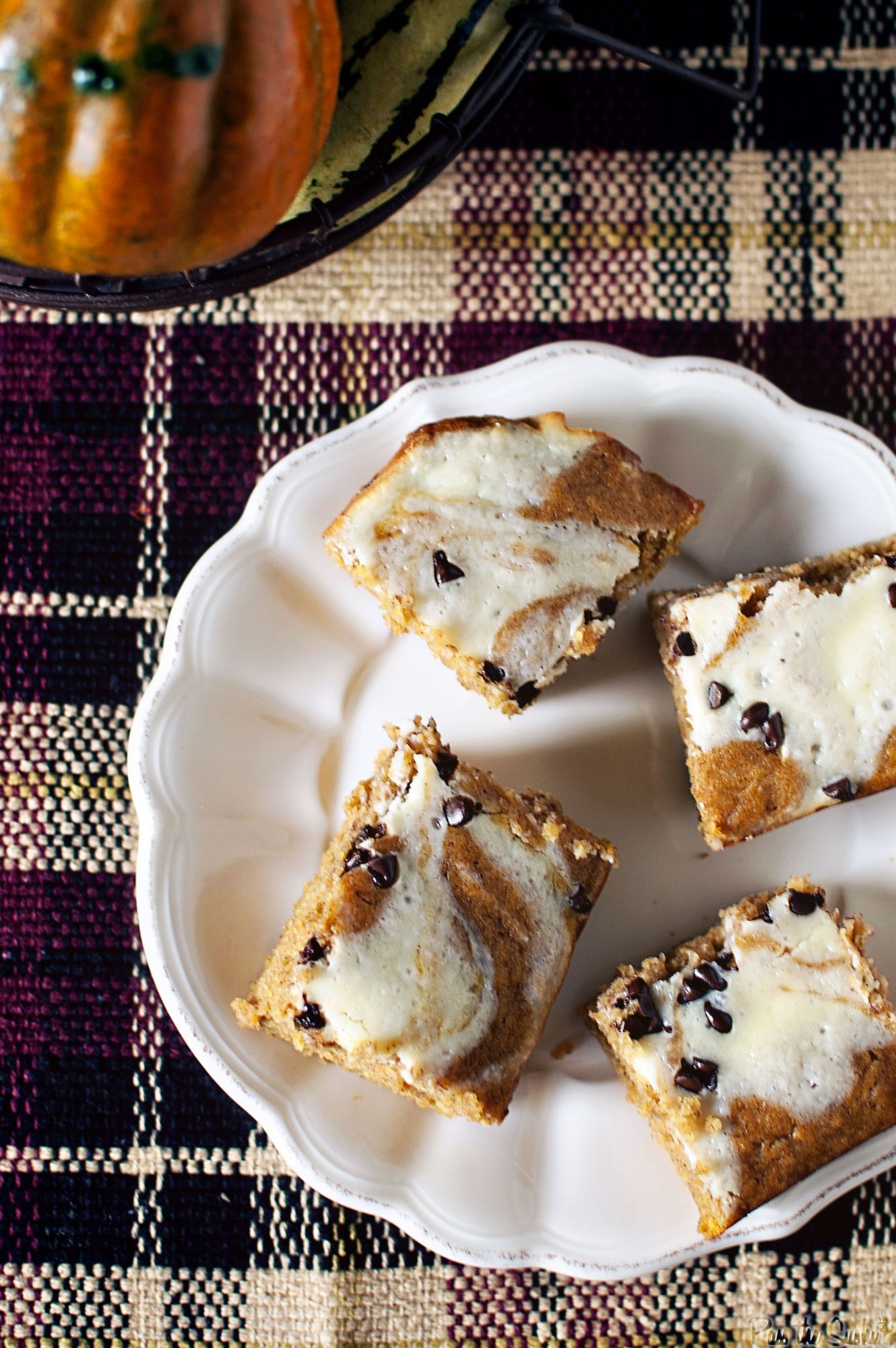 These bars are a perfect fall treat. The thick cake like pumpkin layer went perfectly with the cream cheese swirled in. And the chocolate chips, just consider them them the cherry on top.