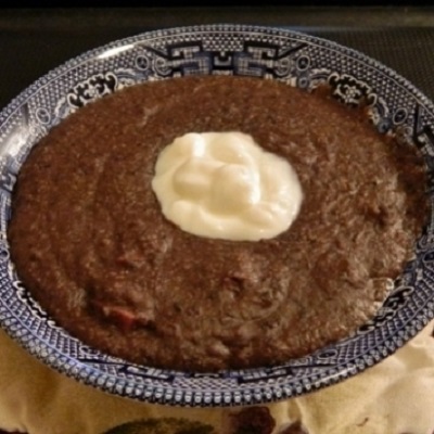 Soak the dried beans overnight in cold water with 1 to 2 inches over the top. Rinse the beans in cold water and drain. Place the beans in a five quart slow cooker. Cover the beans with all the ingredients (except yogurt & turkey bacon/ham) . Cook on low 10-12 hours. Stir and check occasionally to make sure the beans are not getting dry, add water if necessary. When the beans are soft it is done. Some like it pureed to a smooth soup (like me), some like it with some beans still in it. Next, cook the turkey bacon till crispy or you can use bacon or cut up ham. Add to soup and let it sit overnight for best results. Warm it up the next day and top with a dollop of Greek yogurt and sprinkle some minced green onions over the top. Mmmmm, so good! No need for a side with this. Its very filling!