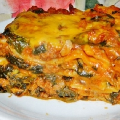 While the water and noodles are boiling, add thawed, 1 lb of ground beef to a large pot and just enough water to cover the beef, boil beef gently, breaking apart, till beef is cooked and water has evaporated. Do not let it burn or brown too ark. To the pot of beef, add onions, mushrooms, italiano seasoning & garlic powder and mix thoroughly. Putting aside 1/4 cup of spaghetti sauce, and add 2 3/4 to the meat mixture and simmer. Squeeze excess water out of thawed spinach, pull apart and add to pot mixing it all together.
