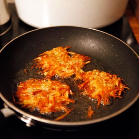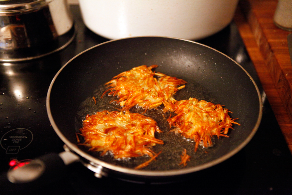 Heat a shallow amount of oil on a skillet. Place an ice cream scoop of the potato mixture (about three depending on the size of your skillet) on the skillet