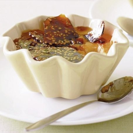 Place the water and extra sugar in a small heavy-based saucepan over low heat. Cook, stirring, for 4 minutes or until the sugar dissolves. Bring to the boil. Cook, without stirring, for 5 minutes or until the syrup turns almost deep golden. Remove from heat. Add the sesame seeds and stir to combine. Pour the toffee mixture among the custards. Place the custards in the fridge for 10 minutes to set. Serve.