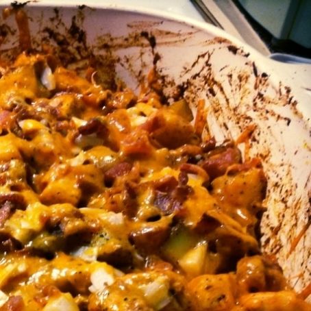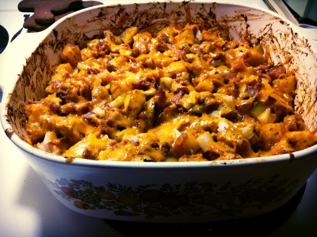 Sprinkle onion and bacon over potato/chicken mixture. Top with cheese.