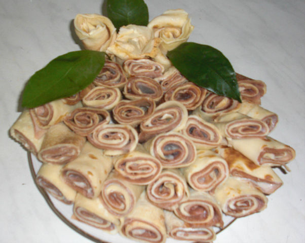 MAKE ROLLS : sliv.maslo melt . Lubricate white pancake, then - 1 spoonful of cream , chocolate and flatten the top , apply cream on it and roll in roll , cut into 3-4 pieces.