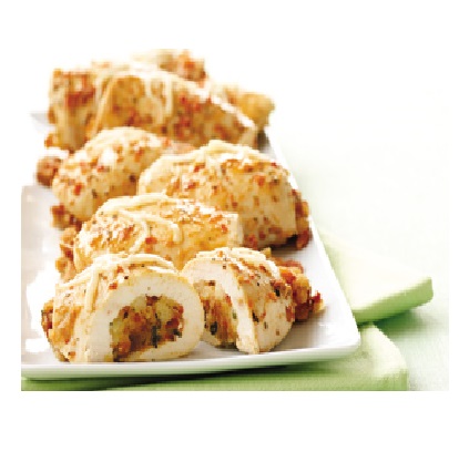 Place chicken breasts, top sides down, on cutting board. Spread chicken with stuffing mixture. Starting at 1 narrow end, tightly roll up each breast. Place, seam sides down, in 13x9-inch baking dish; drizzle with dressing.