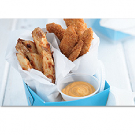 Turn potatoes over with spatula; push to one side of baking sheet. Place chicken on other side of baking sheet. Bake 15 min. or until potatoes are tender and chicken is done. Serve with mustard for dipping.