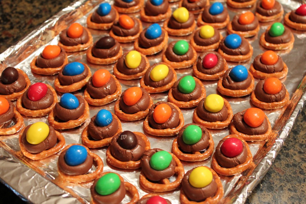 Place in preheated oven 1 to 2 minutes, until kisses melt. Remove from oven and place one candy-coated chocolate in the center of each pretzel. Chill in refrigerator until set.