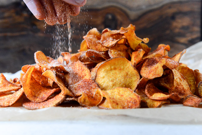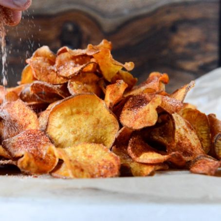 Drain potato; place on paper towels and pat dry. In an electric skillet, heat 1-1/2 in. of oil to 375°. Fry potato slices in batches for 1-2 minutes or until golden brown, turning once. Remove with a slotted spoon; drain on paper towels. Immediately sprinkle with seasoning mixture. Store in an airtight container. Yield: 4-1/2 cups.