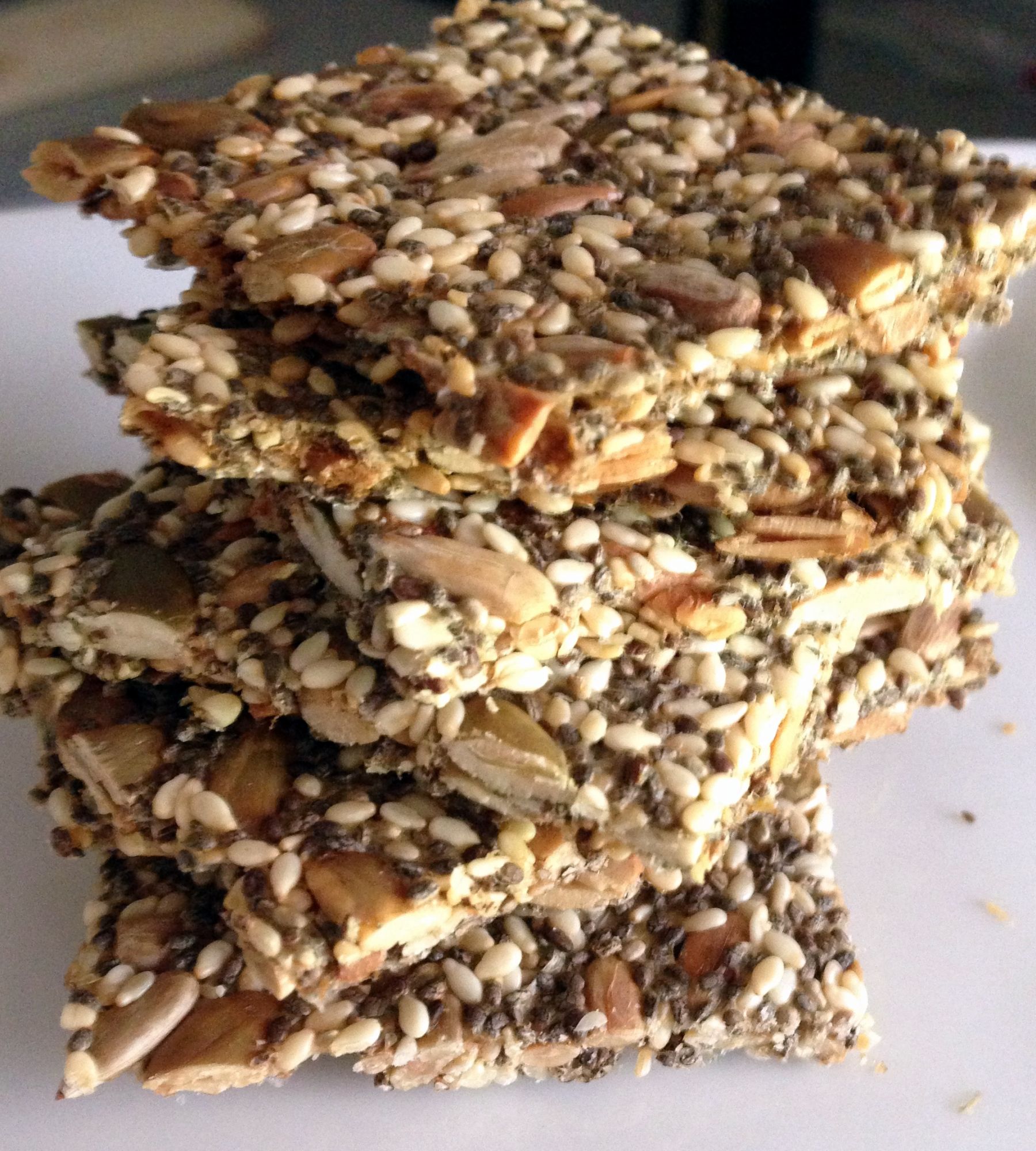 In a large bowl, mix the seeds together. In a small bowl, mix the water, grated garlic, and grated onion. Whisk well. Pour the water mixture onto the seeds and stir until thick and combined. Season with salt, and optional Herbamare and Kelp granules, to taste. Add spices or fresh herbs if you wish.