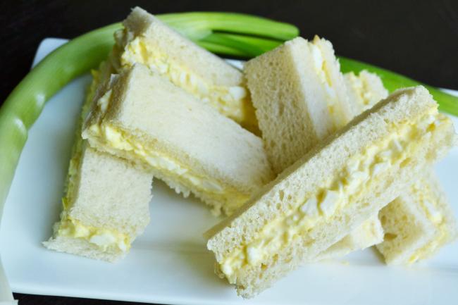 Chop the hard boiled egg into small dice. Using a fork, mix in the mayonnaise salt, pepper, and chives or green onion. If a smoother consistency is desired, press with back of fork while mixing. Spread egg mixture on slice of bread and top with the other slice. Make a diagonal cut across sandwich to make two triangle tea sandwiches.
