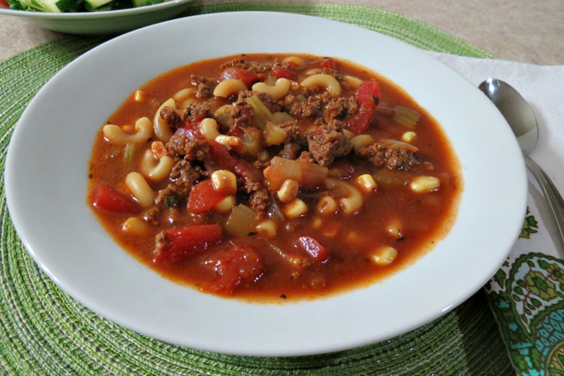 mix. Stir in water, tomato sauce, and Soya sauce. Then add celery and carrots. Coverand cook on low for six to eight hours. Turn on high, add macaroni and Parmesan cheese.