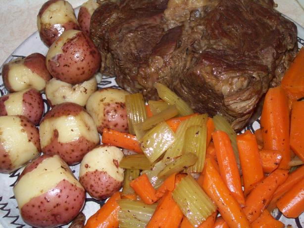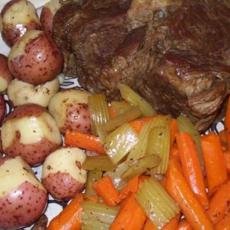 In a slow cooker, mix cream of mushroom soup, dry onion soup mix and water. Place pot roast and all vegetables in slow cooker and coat with soup mixture.