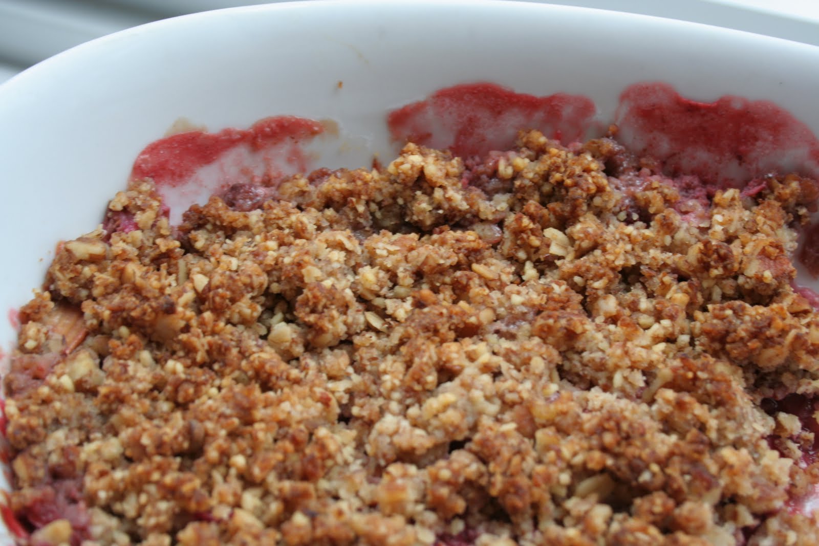 Mix 1 1/2 cups flour, brown sugar, butter, and oats until crumbly. You may want to use a pastry blender for this. Crumble on top of the rhubarb and strawberry mixture.