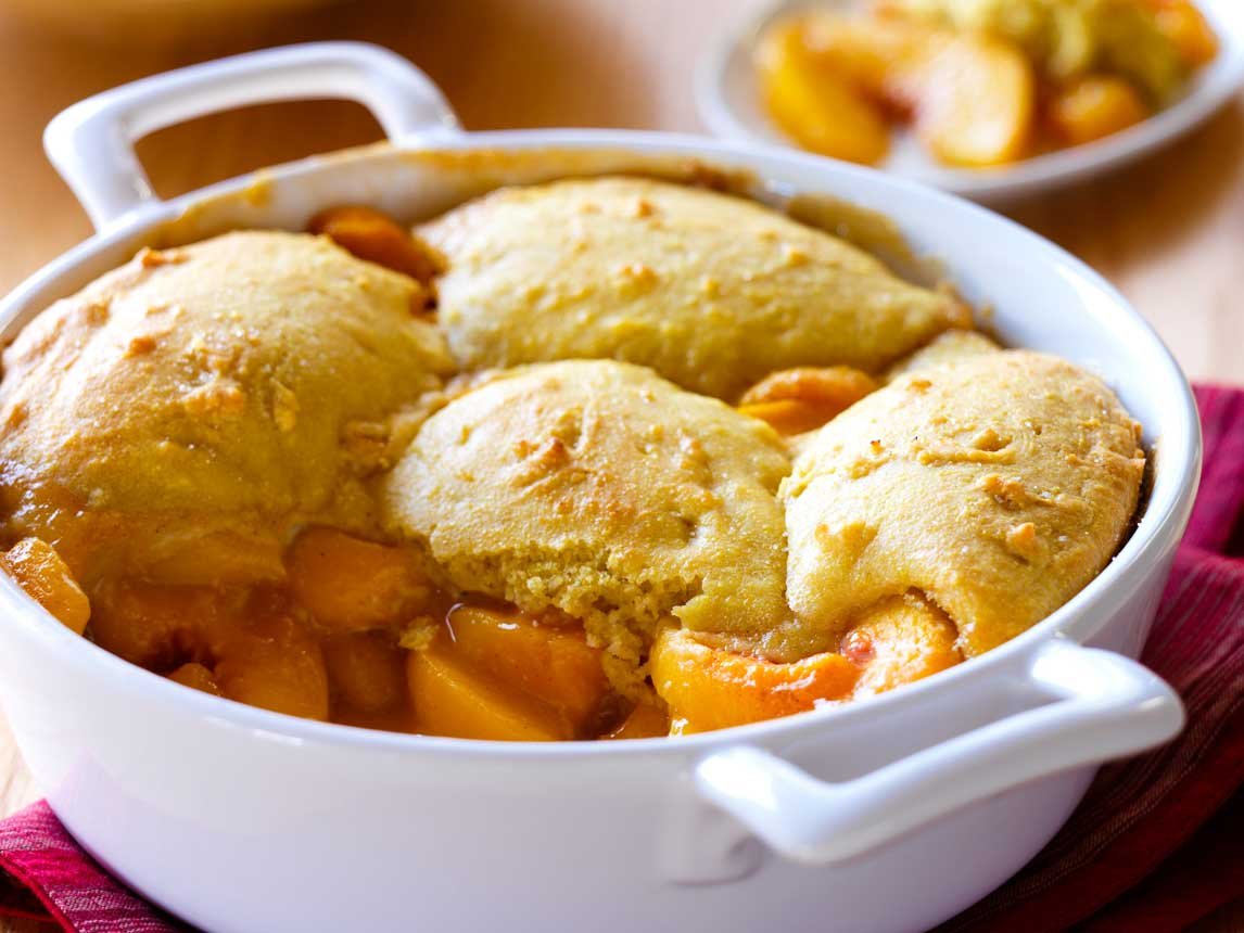 Remove peaches from oven, and drop spoonfuls of topping over them. Sprinkle entire cobbler with the sugar and cinnamon mixture. Bake until topping is golden, about 30 minutes.