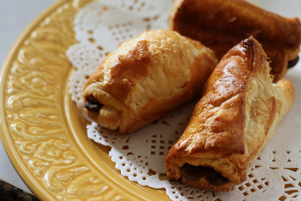 Fold the side of the puff pastry over the third containing the chocolate, and flip the roll so that the seam is on the bottom facing the pan. If you leave the seam up, the puff pastry will burst open.