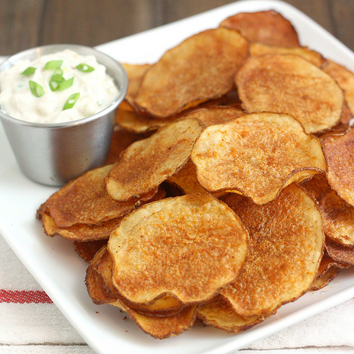 Slice the potatoes into very thin rounds (about 1/16-inch). Place them in a colander and rinse thoroughly with cold water. Dry completely.