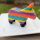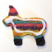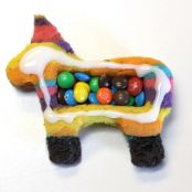 Put another outline of frosting glue on the middle cookie and place the opposite-cut piñata cookie on top (so that the pretty side is facing out). Let these sit and harden for at least 30 minutes before you stand them upright.