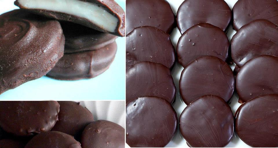 Drop frozen mints into chocolate to cover. Place on wax paper covered cookie sheet.