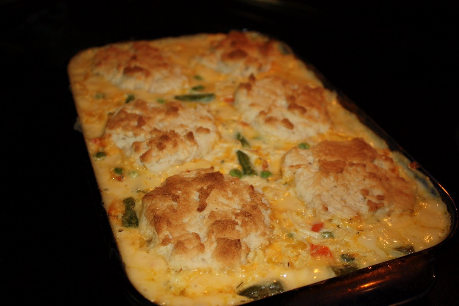Mix biscuit mix, 1/2 cup of milk & egg. Pour over vegetable mixture.