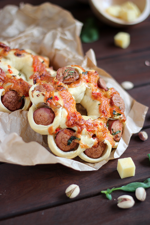Cut each piece into slices a few inches wide, through all of the sausage but do not cut all the way through the dough. Turn each slice up to become visible and seal the ends (with wet fingers) to form a ring.