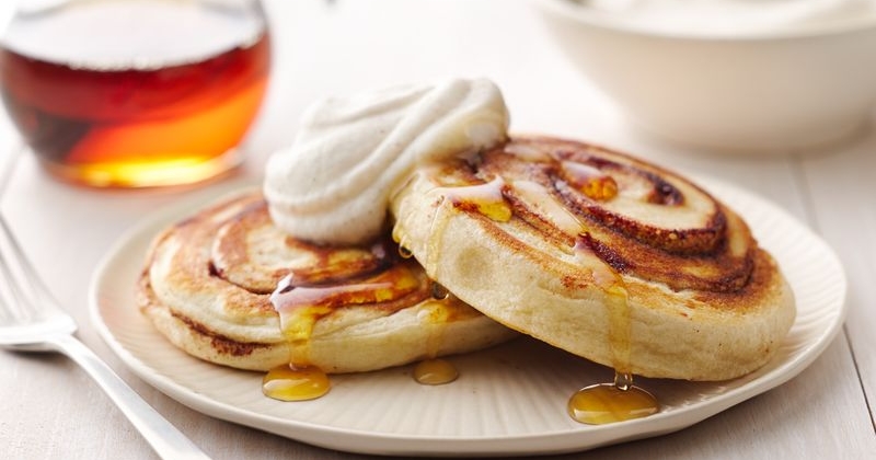 Wipe out the pan with a paper towel (important), and repeat with the remaining pancake batter and cinnamon filling. Re-warm the glaze briefly, if needed. Serve pancakes topped with a drizzle of glaze.