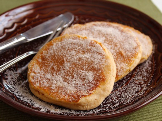 Flip pancakes when bubbles appear all over the surface of the pancake and begin to pop, about two minutes. Cook another 1-1 1/2 minutes. Serve sprinkled with cinnamon sugar.