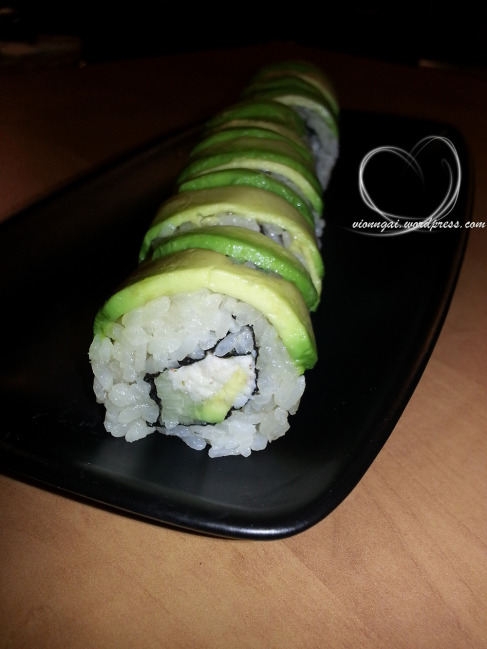 Assemble: press half the portion of rice onto nori sheet. flip over, add half of the cucumber and crab meat and a quarter of the avocado. roll the sushi on a bamboo mat. for the other avocado quarter, cut thinly and place at the seam of the roll. press and roll again. cut with a sharp knife.