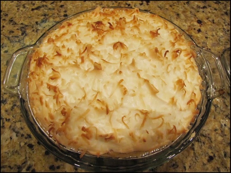 In a small bowl, beat the egg whites, cream of tartar and vanilla on medium speed until soft peaks form. Gradually beat in sugar, 1 tablespoon at a time, on high until stiff peaks form. Spread meringue over hot filling, sealing edges to crust. Sprinkle with coconut.