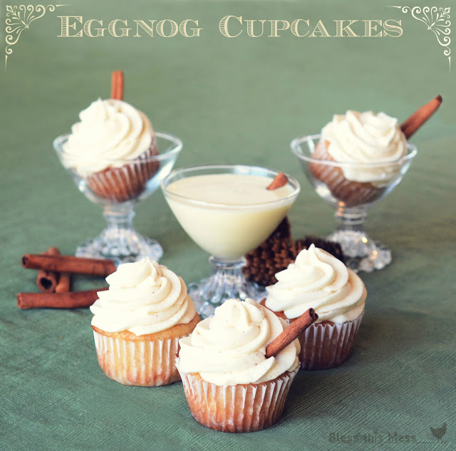 Prepare the cupcakes: Preheat the oven to 350 F. Line cupcake tin with paper liners. In a large bowl add the eggnog, melted butter, vinegar, vanilla, and sugar. Beat on medium speed until well combined.