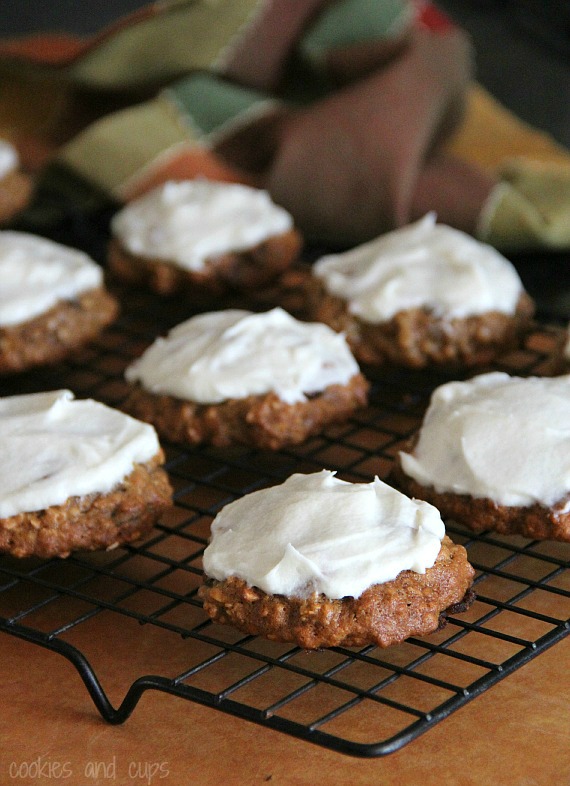 Turn mixer down to low and add in powdered sugar until just combined. Turn mixer up to medium and beat until smooth, about 1 minute. Spread a tablespoon of frosting onto each cookie.