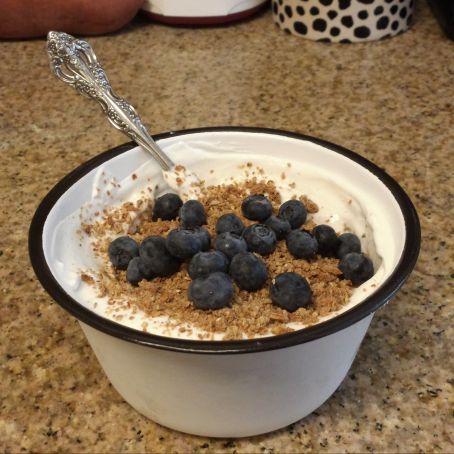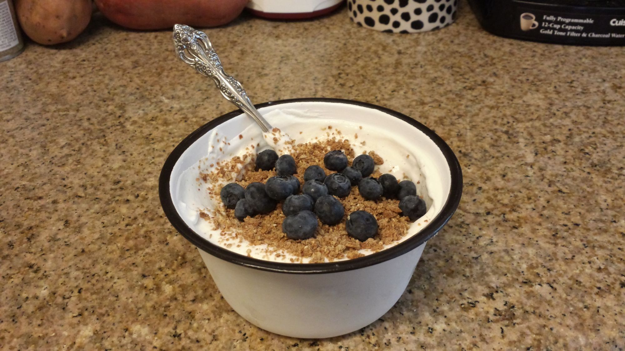 Once the two are mixed sprinkle the 1/4 cup of cereal and throw a handful of blueberries on top to seal the deal.